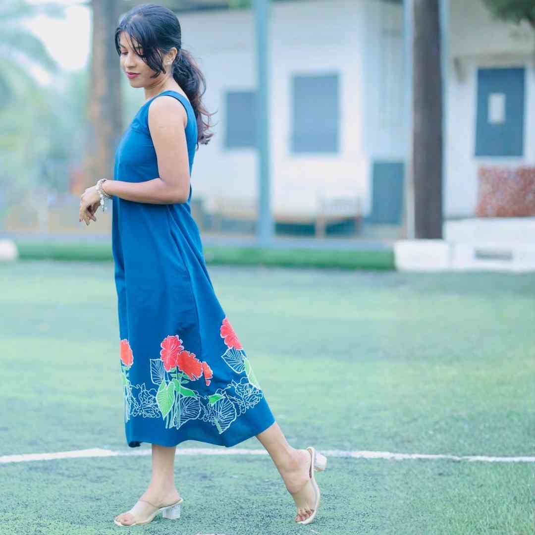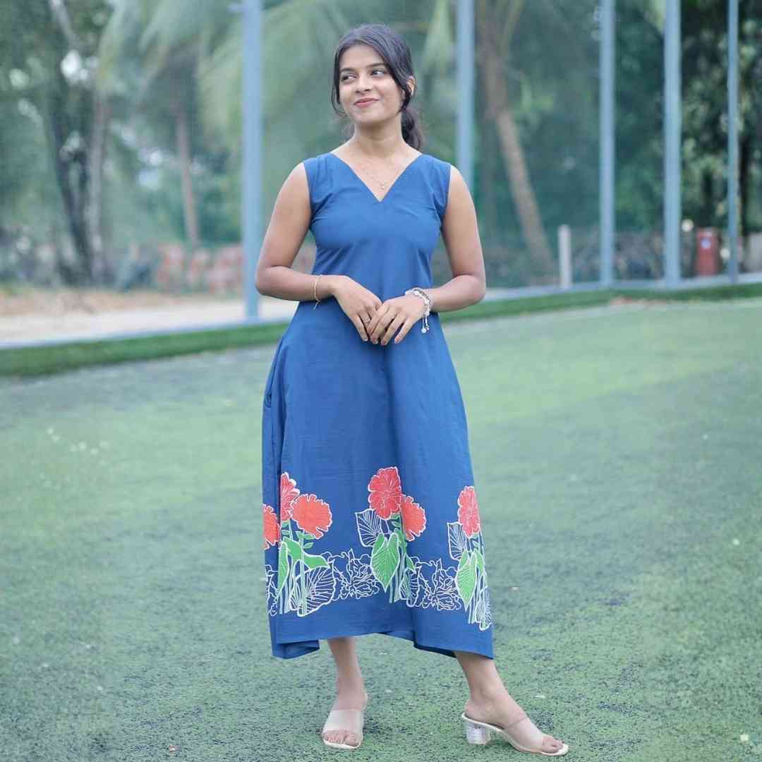 A comfortable and stylish dress with a 42-inch length, featuring a flattering V-neck design and neatly attached inside sleeves for a clean look. Comes with a functional pocket in the top and is designed without lining for a lightweight, breathable feel. Dispatched within 2–3 working days with free shipping across Kerala and international shipping available.