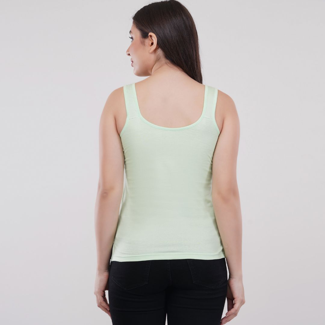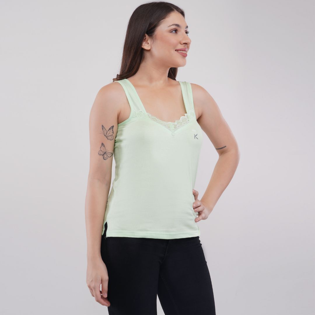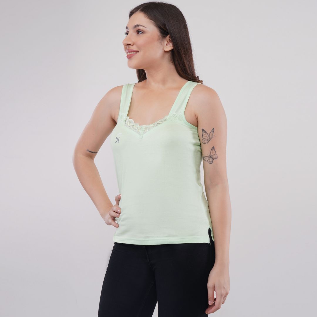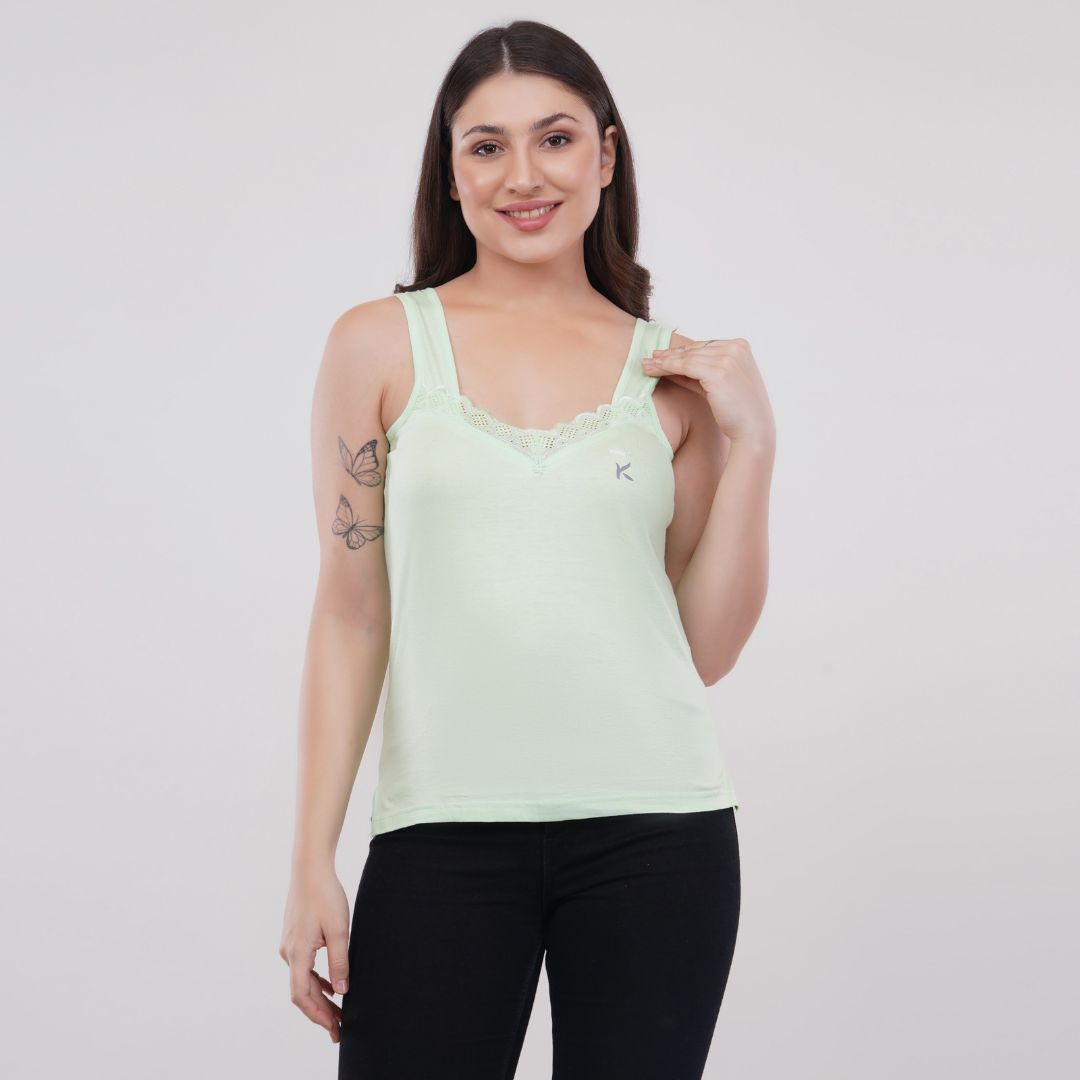 Made from 100% premium combed cotton fabric provides superior comfort & skin friendly v neck at front and oval neck back pretty laces embellish the neckline fabric binding at the ends self-fabric broad shoulder strap gives a good hold and utmost convenience covers bra straps provides a snug and flattering fit breathable fabric wicks away moisture quickly label free comfort